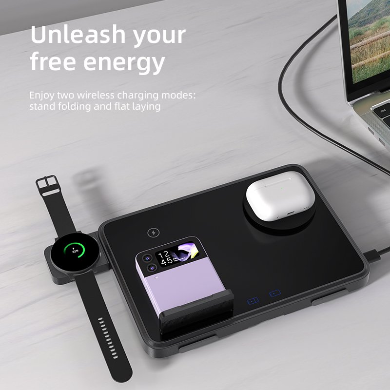 This 15W three-in-one wireless charger lets you charge two phones and a smartwatch or earbuds simultaneously. Perfect for multiple devices, it reduces clutter and simplifies your charging routine, keeping all your essentials powered efficiently.