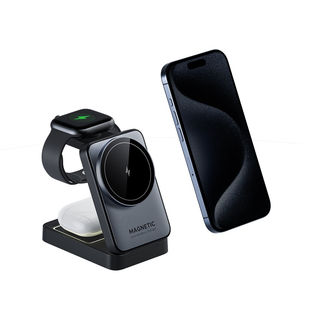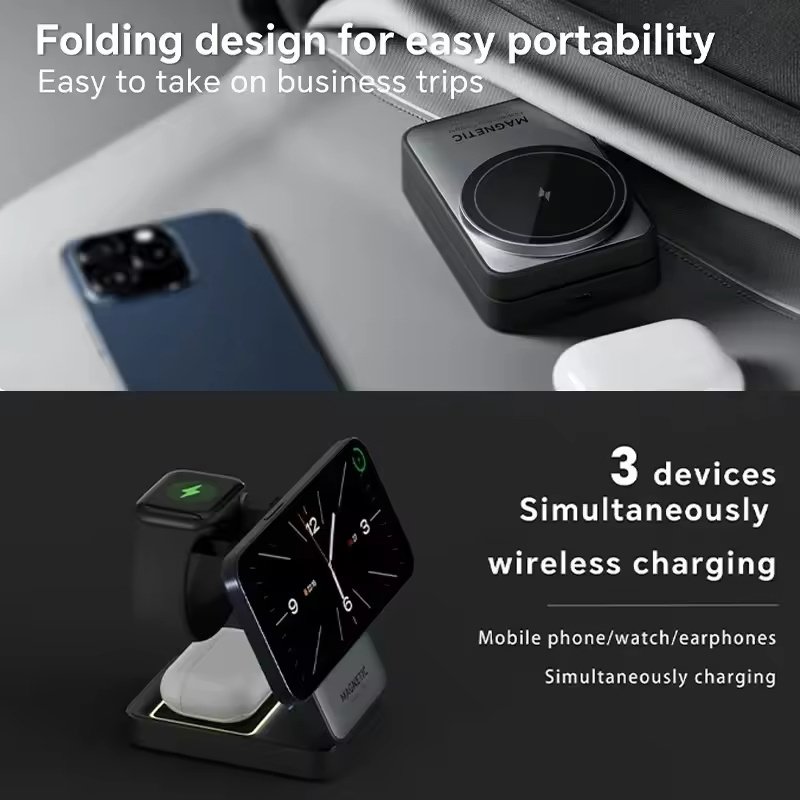 This 3-in-1 wireless charger powers your phone, earbuds, and smartwatch simultaneously in one sleek setup. Its foldable bracket saves space and makes it perfect for travel, your desk, or your bedside table.