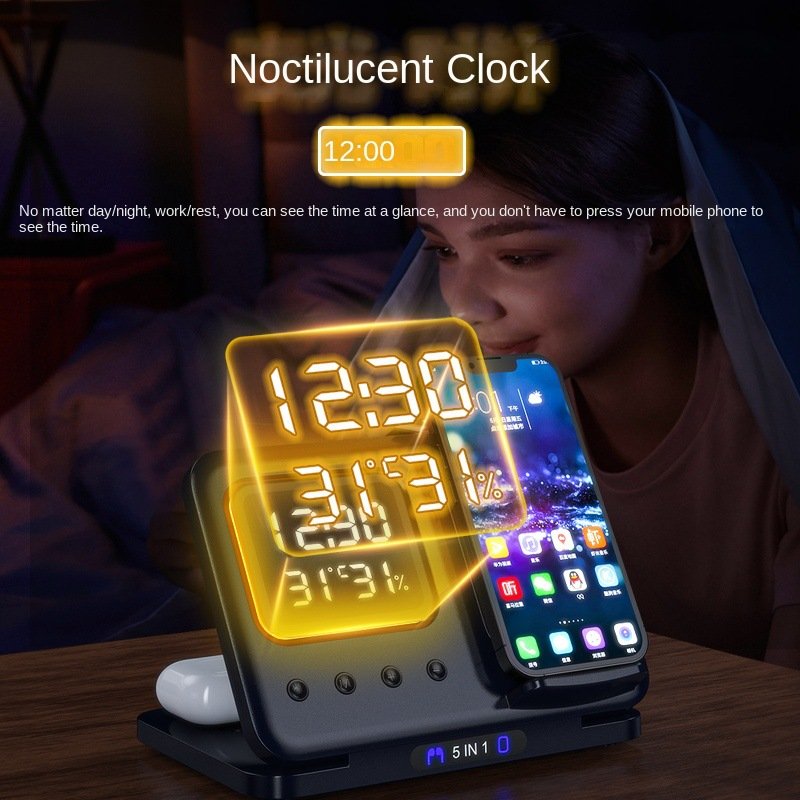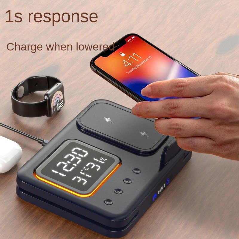 This five in one wireless charging dock powers your phone, watch, and earbuds while displaying time, temperature, and humidity for a complete bedside and desktop setup.